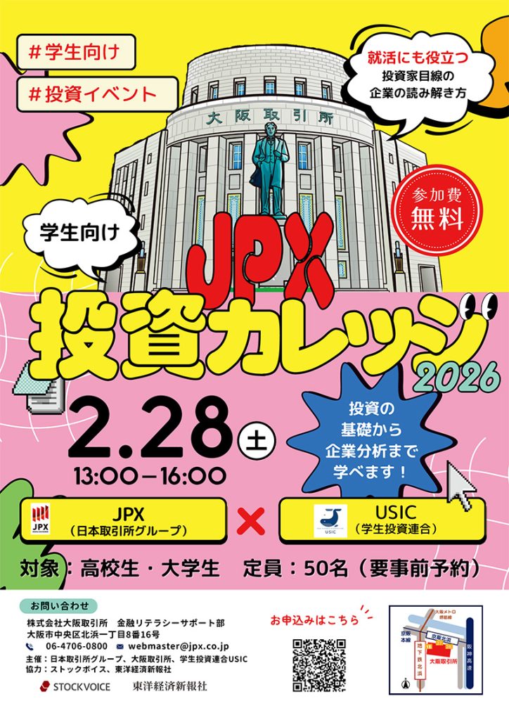 「五代友厚生誕スタンプラリー&特別展示」は2月13日(金)まで。2月28日(土)開催「JPX投資カレッジ2026」は学生投資連合USICとの共催で、高校生・大学生が対象。大阪取引所公式サイトより事前予約必須。