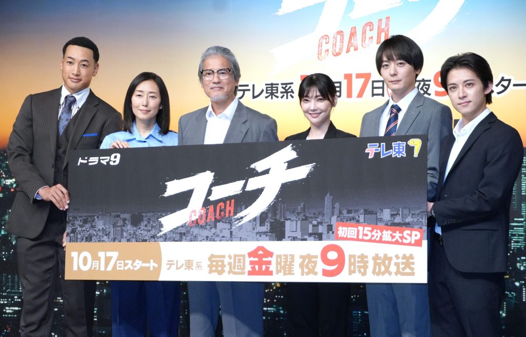 ドラマ「コーチ」の記者会見が東京都内で行われ、出演者の唐沢寿明、倉科カナ、犬飼貴丈、関口メンディー...