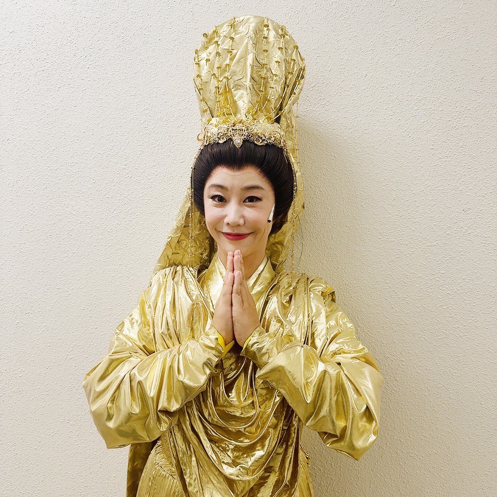 しかし、私の落語を聴いてもらったあとに、その人物たちが動き踊るなんて、なんと幸せなことか! 私は狂言回しとして、ストーリーテラーのような役割で出演。さらに西川流の皆さまと踊りまで踊らせていただき、さらにラストシーンでは観世音菩薩にまでしていただくという、とんでもない設定に震えた。