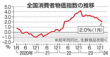 1月の消費者物価、2.0%上昇 1年10カ月ぶりの低水準 2024年2月27日 OvO 共同通信 47NEWS 総務省が27日発表した1月の全国消費者物価指数(2020年=100、生鮮食品を除く)は、前年同月比2…… さらに見る