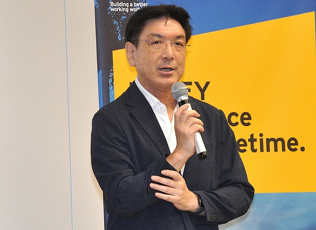 あいさつするEY新日本監査法人の牛島慶一さん=大阪市のコングレコンベンションセンター、2025年10月3日