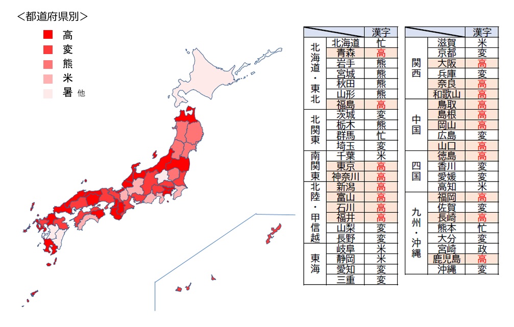 ちなみに、回答した中小企業の所在地の都道府県別で「高」以外の漢字を見ると、茨城・埼玉・山梨・長野・愛知・三重・京都・兵庫・広島・香川・愛媛・佐賀・大分・沖縄の14府県は「変」。岩手・宮城・秋田・山形の東北4県と、栃木県は「熊」。千葉・岐阜・静岡・滋賀・高知の4県が「米」だった。北海道・群馬・熊本は「忙」。宮崎が「政」だった。