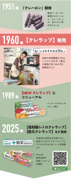 やがて技術者たちは「この素材を家庭の暮らしにも役立てたい」と考え、食品を直接包める安全なフィルムの開発に挑戦。安全性、透明性、耐久性など数え切れない試行錯誤の末、1960 年7月に日本初の家庭用食品包装ラップ「クレラップ」が誕生しました。初めはわずかしか売れませんでしたが、冷蔵庫や電子レンジの普及と共に一般家庭に浸透していきました。
