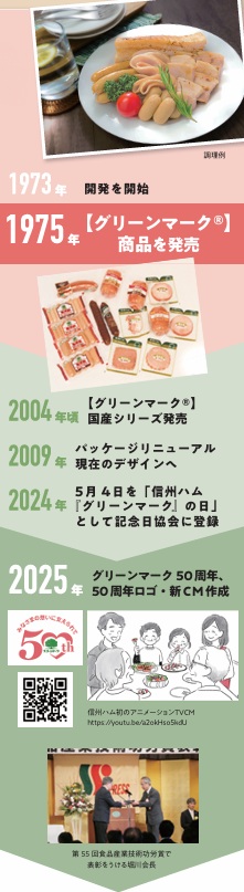 1975 年、信州ハムは日本で初めて発色剤・着色料・保存料・リン酸塩を使用しないハムを世に送り出しました。それが「グリーンマーク®」シリーズです。