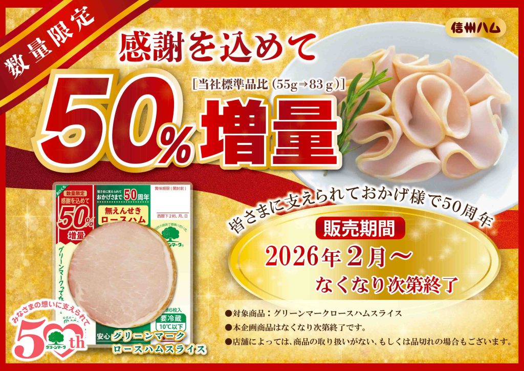 また、2月から、「グリーンマークロースハムスライス55g」の内容量を通常から50%増量する「50周年記念 特別キャンペーン」を数量限定で実施。83グラム(標準枚数4枚→6枚)で提供する。パッケージには、50周年ブランドサイトにアクセスできるQR コードを掲載する。