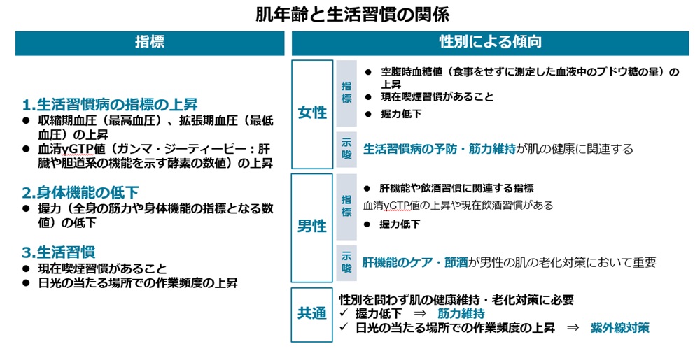 また、性別によって要因が異なり、女性は空腹時血糖値の上昇、喫煙習慣、握力低下と関連。男性は血清γGTPの上昇、飲酒習慣、握力の低下が関連していた。握力低下と日光に当たる場所での作業頻度の上昇は、男女共通していることから「筋力維持と紫外線対策は肌の健康維持に必要となる可能性が示唆される」と指摘している。