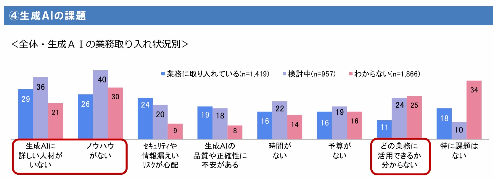 生成AIの業務取り入れ状況別に、生成AI導入の課題についても聞いた。その結果、「生成AIを検討している(未導入)企業」(957社)は、「取り入れている企業」(1419社)と比べて、「生成AIに詳しい人材がいない」(36%)、「ノウハウがない」(40%)、「どの業務に活用できるかわからない」(24%)を選択した割合が高かった。