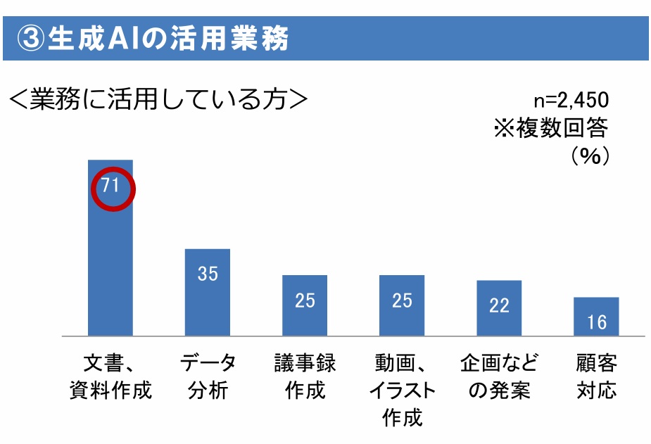 活用している2450社に具体的な内容(複数回答)を聞くと、「文書・資料作成(71%)」が最多。以下、「データ分析」(35%)、「議事録作成」(25%)、「動画・イラスト作成」(25%)、「企画などの発案」(22%)、「顧客対応」(16%)と続いた。