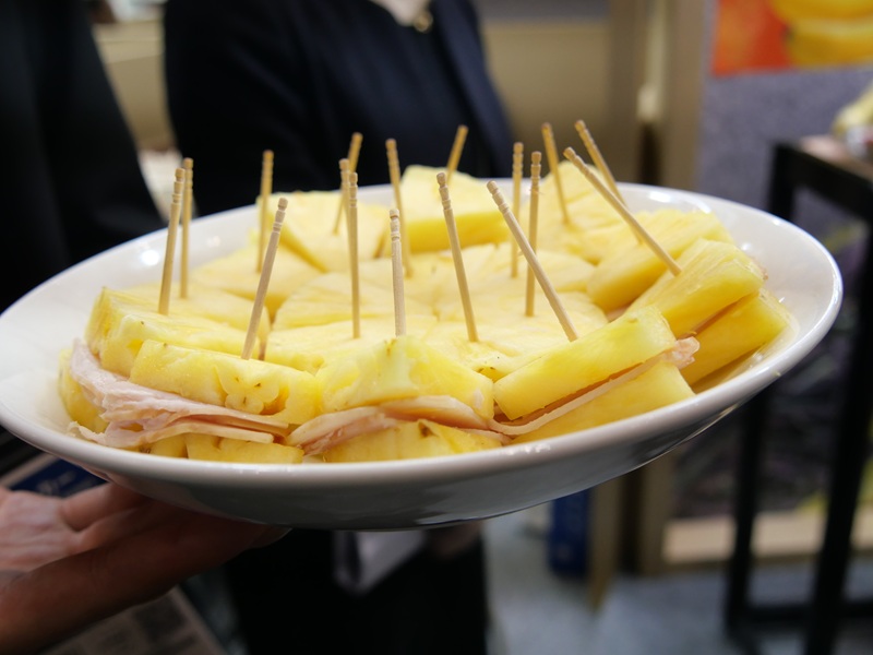 その新たな台湾産フルーツの楽しみ方の一例として、青木社長はパイナップルでハムを挟んだ試作メニューを紹介。用意した同メニューを陳部長に振る舞った。陳部長は「パイナップルの甘さとハムの塩味がほどよく調和して、両者はとても相性が良い。科学的な分析の成果ですね。このメニューは日本の消費者の皆さまにも好まれると思います。食事の際のデザートとして食べていただきたい」と述べ、最後に「おいしい」と日本語で“パイナップルハムサンド”の完成度の高さを強調した。