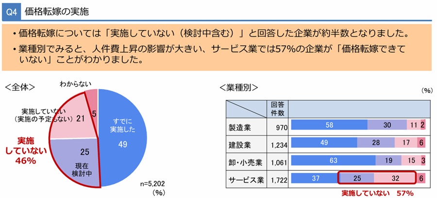 価格転嫁については「実施していない」(検討中含む)と回答した企業が約半数だった。業種別でみると、人件費上昇の影響が大きいサービス業で、57%の企業が「価格転嫁できていない」と回答した。