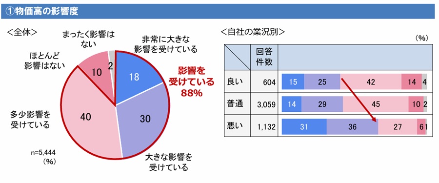 物価高の影響を「受けている」と回答した企業は、「非常に大きな影響を受けている」(18%)、「大きな影響を受けている」(30%)、「多少影響を受けている」(40%)を合わせて88%と、全体の約9割に及んだ。