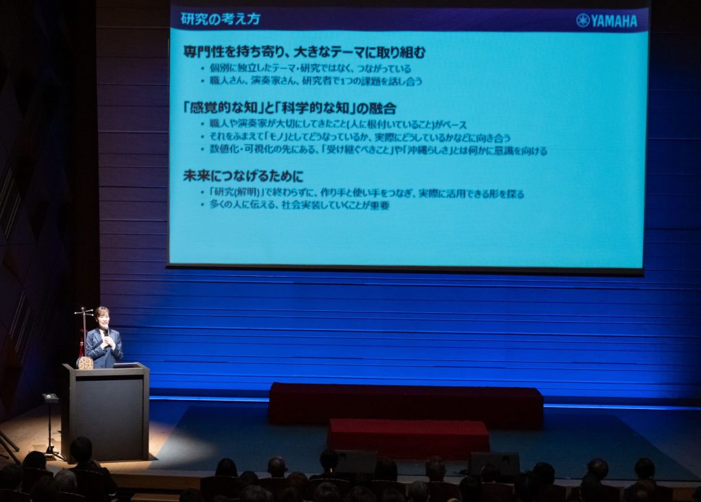 注目すべきは、このプロジェクトにおけるヤマハの役割と姿勢である。ヤマハの先進技術開発部・森隆志 副部長と同部新価値グループ稲岡紋子氏の解説によれば、同社は単なる技術提供者としてではなく、地域文化の当事者とともに歩む「共創」のパートナーとして参画。その根底にあるのは、技術を通じて社会や文化の多様性に貢献するという強い信念だ。プロジェクトでは、ヤマハが長年培ってきた「モノ(楽器)」と「ヒト(感性)」の研究ノウハウが、三線の「現在地」を解き明かすために惜しみなく投入された。