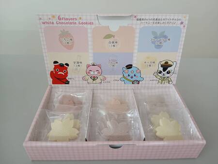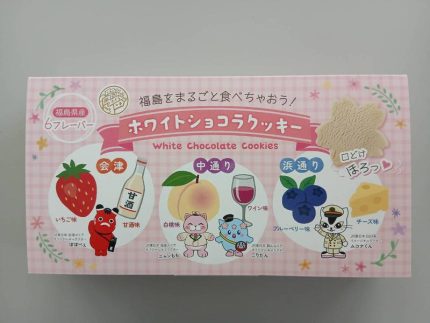 クッキーはアソート(詰め合わせ)になっており、浜通りがブルーベリー味とチーズ味、中通りが白桃味とワイン味、会津が甘酒味といちご味と、6種類のフレーバーをホワイトショコラ生地で包み込んだ。