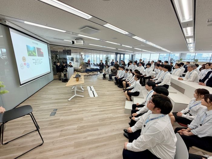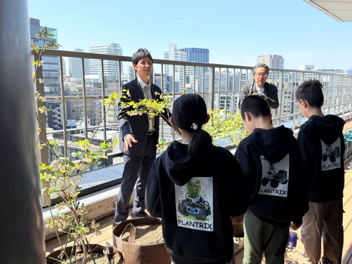 社員たちからは、「ロボットに乗った植物だけではなく、プランターや畑に植えられている野菜たちの声を聞き取るような仕組みも、君たちなら考えられるのではないか」、「作物の出来不出来の予測から、クマの出没率を予測するようなシステム開発につなげられる可能性もあるのでは」、「実際に植物を育てている人、植物に関わる人たちにどんなものが欲しいか話を聞いて実装できると、よりよいものが作れると思う」などの感想が寄せられた。プレゼンの終了後、子どもたちと家族は、同社12階の屋外プランターに案内され、ITを活用して多様な植物を栽培する実証実験について説明を受けた。