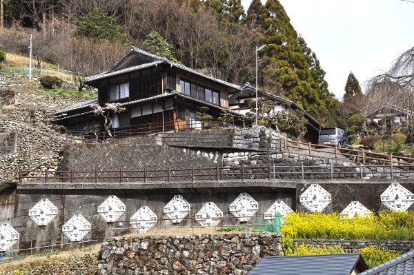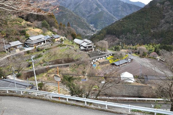 井上さんは傾斜が一段ときつくなり始めたころ、分厚い資料を見せて、山腹に築かれたこの地の集落は、地滑りでできた平地を生かして形成されたと説明する。その説明を聞いた後、眼下に点在する家々を眺めると、なるほど奥深い山腹にこれだけの家を建てられる平地を造るのは、人力では難しそうだ。ちょっとしたブラタモリ気分を味わう。
