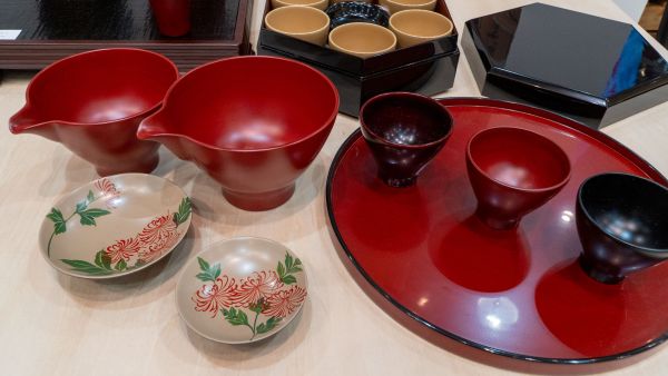 今瀬さんが手掛けた、白漆に菊を描いた盃(手前左)や片口などの漆器