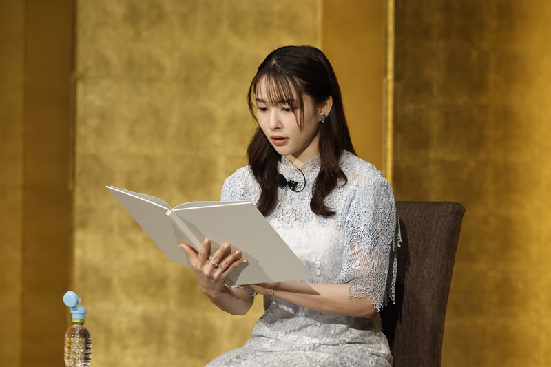 その後、桜井さんは、しんくみ大賞としんくみきずな賞の二つの受賞作文を、朗読という形で紹介した。情感豊かな表現力で、2人の受賞者が作文に込めた気持ちを臨場感たっぷりに再現すると、会場は静けさに包まれた。桜井さんが読み終えると、来場者から大きな拍手を受けた。