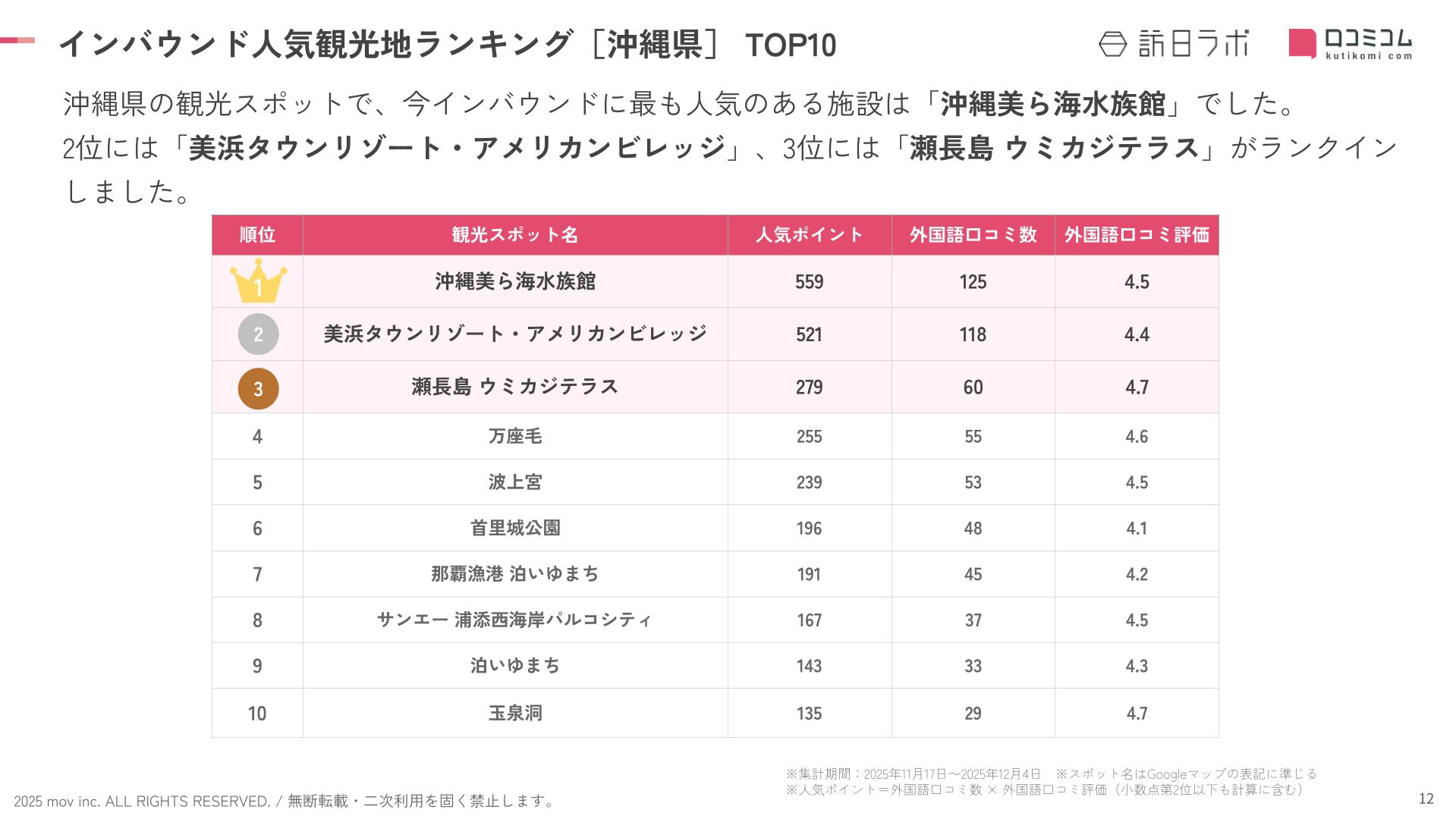 これからの寒さ厳しい季節で、観光地として沖縄に関心が向くところだが、注目するのは日本人だけではなく、海外からもインバウンド客が沖縄に多数訪れる。では、海外観光客に人気の沖縄観光スポットはどこか? インバウンドビジネスメディア「訪日ラボ」と集客一元化プラットフォーム「口コミコム」を運営するmov(東京)は、沖縄県の観光地に寄せられた最新の口コミデータから、独自の「インバウンド人気観光地ランキング【沖縄県 編】」を発表した。