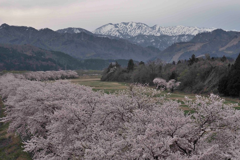飯豊連峰を源とする胎内川上流部、夏井河川敷の両岸には、約1キロにわたるソメイヨシノの桜並木が続く。この道は地域の人々にとって長く“季節の合図”であり、同時に“帰ってきたくなる風景”として大切に守られてきた。この千本桜には明確な起源を示す記録が残っているわけではなく、先人たちが「ここに春が続いていく風景を残したい」と願い、一本一本桜を植え継いできたという思いが語り継がれているという。