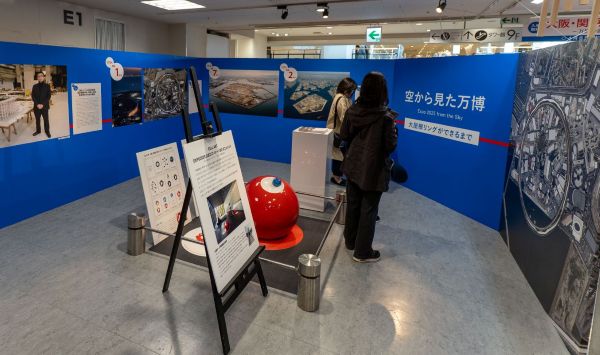昼と夜で表情を変えていた上空からの大屋根リングを撮影した「空から見た万博」、1970年大阪万博からの継承や変化をパビリオンなどの写真で比較できる「パビリオンが語る」、誘致活動からの様子を記録した「舞台裏の3904日 万博ができるまで」など6章に分け、200枚近い写真を展示。当時の記事もパネルで紹介され、万博の物語をたどることができる。