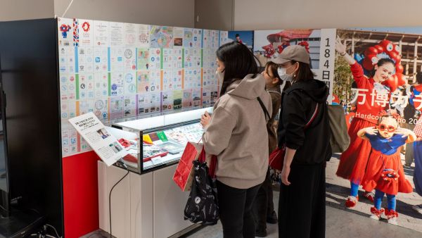 受話器から物語が聞こえるNTTパビリオンの「せかいがきこえる伝話」、電気事業連合会のパビリオン「電力館」のタマゴ型デバイス、住友グループの「住友館」のランタンのほか、「ヨヤクナシダンス」で人気を呼んだインドネシアパビリオンのユニフォームなども展示。万博愛好家の収集した膨大な数のスタンプのパネルやピンバッジを収めたコーナーで思い出を語り合う家族連れや、万博の夜空を彩った打ち上げ花火の動画を前に当時の余韻に浸るグループも見られた。