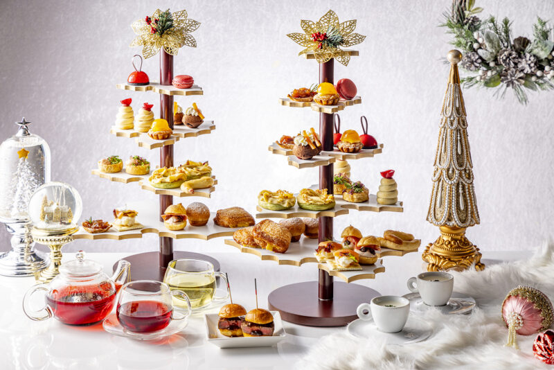 ツリーのようなフォルムがユニークなオリジナルスタンドには、クリスマスらしいスイーツパンやお食事パンがまるでオーナメントのようにのせられ、目も舌も楽しめる。10種類以上のパンやサンドイッチに加え、「ビーフステーキバーガートリュフソース添え」、「カリフラワーのスープ」とマーブルラウンジのスイーツビュッフェから2種類のスイーツもセットになる。税込み5800円(土・日・祝日同6500円、12月22日~25日は同6900円)。