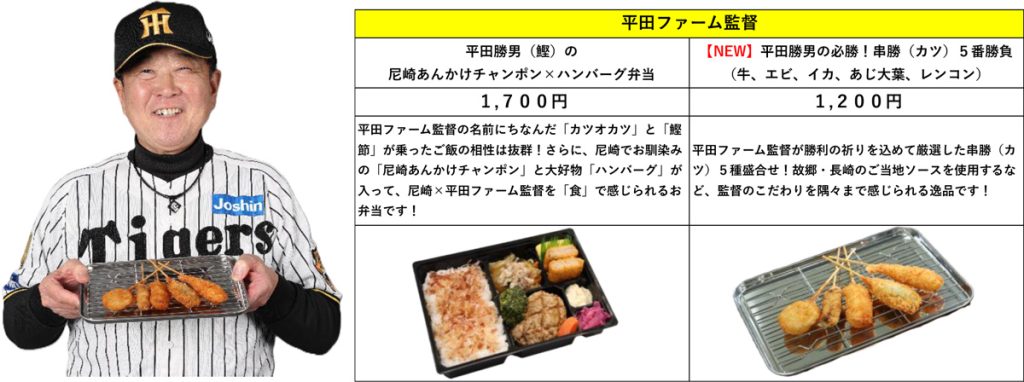 また、3月7日のソフトバンク戦からは、地元の味と平田監督の名前(勝男)を掛け合わせた「平田勝男(鰹)の尼崎あんかけチャンポン×ハンバーグ弁当」(同1700円)も登場。この弁当には購入特典として、全3種類のオリジナルカードがランダムで1枚プレゼントされ、ファンのコレクション欲をくすぐる内容となっている。