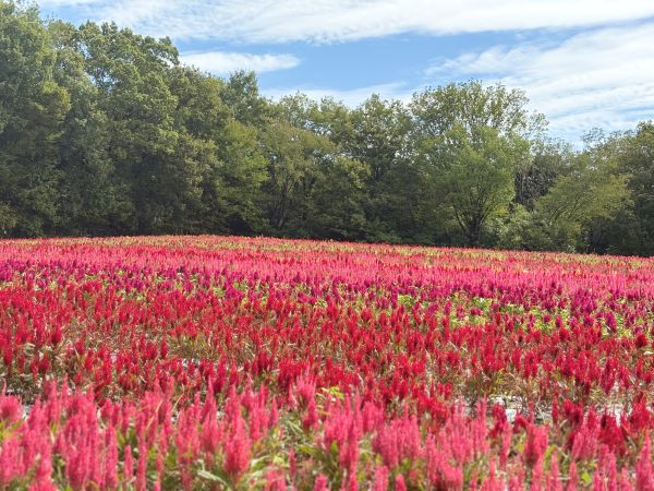 羽毛ゲイトウはヒユ科ケイトウ属で、アジア・アフリカなどを原産とする一年草。草丈は60cmほどで、ふわふわとした羽毛のような花穂が特徴。ケイトウは鮮やかな花色で秋を彩り、万葉集で歌が詠まれているように古くから日本人に親しまれている。その名前は、形や色がニワトリのトサカに似ていることから「鶏頭」と呼ばれたことが由来で、英名でも「cockscomb(鶏のトサカ)」と名付けられている。約4500平方メートルの西口ひろば花畑に、約40万本が植えられている。