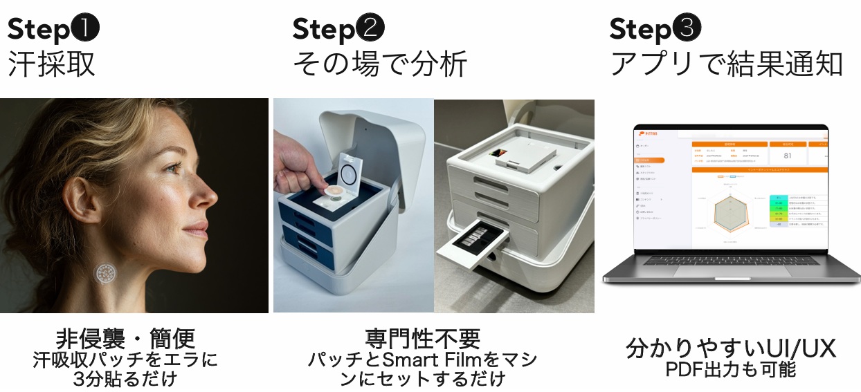 同社は、分析化学、マイクロデバイス、電子工学、分子生物学、AI技術など多岐にわたる専門知識の応用と研究機関との連携で、微量の汗に含まれるアミノ酸を解析することで体液を分析できる独自技術を開発。既に美容サロン、フィットネスジム、ドラッグストアなどのウェルネス現場で郵送分析サービスの導入実績を積み重ね、新たな市場を創出している。