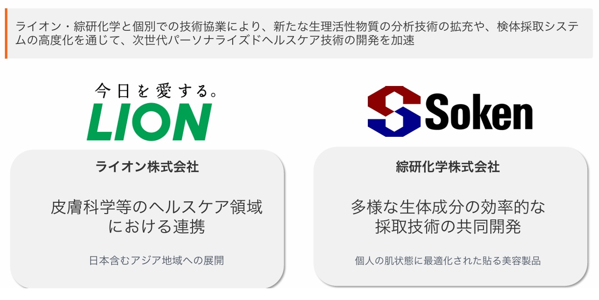 出資事業会社であるライオンならびに綜研化学とは、それぞれ次世代パーソナライズドヘルスケア技術の共同開発に関する技術協業を開始。ライオンとは皮膚科学等のヘルスケア領域において日本を含むアジア市場に向けた連携を、綜研化学とは同社の粘着剤設計技術を生かした検体採取システムの高度化と美容製品領域での新たな展開を進めていく。これらの協業により、PITTANが持つ従来のアミノ酸分析に加えて、低分子タンパク質やホルモンなどの生理活性物質をはじめとする多様な生体成分の分析技術を確立し、日常生活でユーザーがより積極的に健康的な選択を行えるソリューションの実現を目指すという。