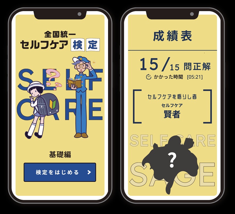必ずしも正しかったり自分に合っていたりするか分からないのがSNS上の情報。そこへの接触率が高い若年層やデジタルネイティブ世代たちが、楽しく学びながら正しい情報を身につけるきっかけとなることが期待されるのが、今回公開した「セルフケア検定」だ。パソコン・スマートフォンから誰でも手軽に無料アクセスでき、全15問の設問に答えることで自身の“セルフケア力”を確認できる。設問は、薬の正しい使い方や保管方法を問う「薬の知識」をはじめ、「食事」「運動」「生活習慣」「美容」の5つのカテゴリーで構成。検定後、「成績表」にはカテゴリーごとのレーダーチャートが表示され、自分自身のセルフケア力の傾向を一目で把握できる。また、検定結果に応じたセルフケアタイプのキャラクター(全17種類)も登場する。回答の速さも加味した全国での順位も表示される。ちなみに、一般公開前に挑戦した鈴木さんは、「迷った部分もありました」としながらも全問正解で、「賢者タイプ」と判定されたという。