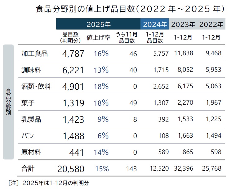 主要な食品メーカー195社における、家庭用を中心とした飲食料品値上げについて調べたもの。2025年通年の値上げは累計2万580品目で、前年の実績(1万2520品目)を64.4%上回り、2023年(3万2396品目)以来、2年ぶりに2万品目を超えた。1回当たりの値上げ率平均は15%と、前年(17%)をやや下回る水準が続いた。