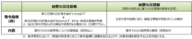 消防法と各自治体の火災予防条例では、一定の条件に基づいて発令される「火災警報」が以前から存在する。しかし、検討会では「罰則を伴う火の取扱制限であり(火災警報の)発令に躊躇(ちゅうちょ)する消防本部の声がある」などとして、強い制限や罰則を伴わない注意喚起として発令できる林野火災注意報と、火災警報でも目的を山火事予防に絞った林野火災警報の創設が提言された。