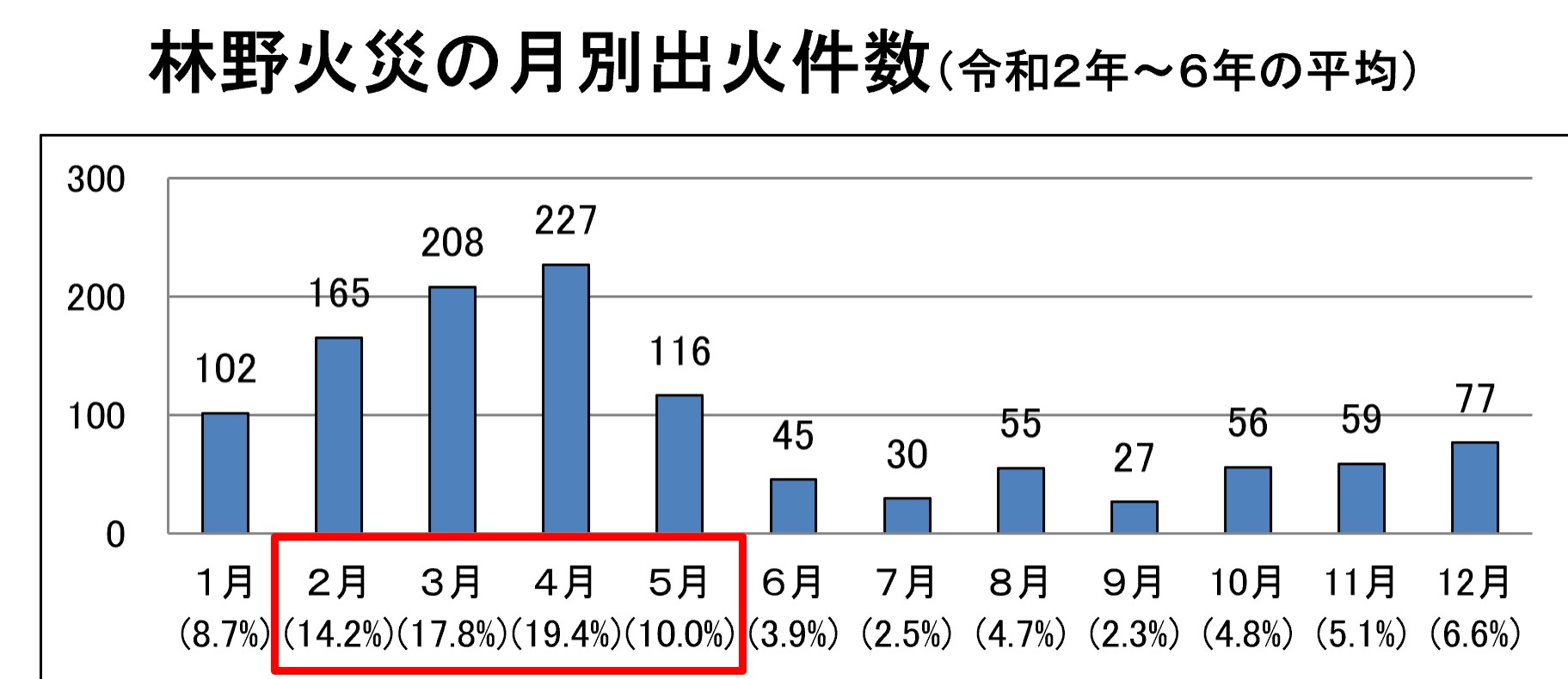 山火事の出火原因は人的要因によるものが多くを占めている。消防庁の調査によると、20~24年の5年間の平均では、年平均約1170件の発生のうち、枯れた草や葉を焼却するための「たき火」や、害虫駆除などを目的として草や木などを広く焼却する「火入れ」が出火原因の半数以上で、放火(疑いを含む)、たばこ、マッチ・ライターが続く。また、山火事は年間を通じて発生しているが、6割超が2~5月に集中。この時期は、たき火や火入れがよく行われる上に、少雨、乾燥、強風という気象条件が重なる。たき火や火入れ等を行うときは、危険な日を避け、決められた手続きに沿って行うことが重要だ。ちなみに、上記5年間の年間の平均焼損面積は752ヘクタールで、平均損害額は約3.2億円に達する。