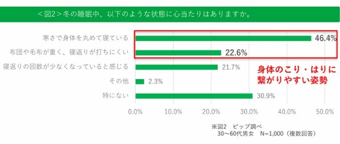 睡眠の質を高めるために寝具や生活習慣を整える「眠活」が広がる一方で、冬ならではの“落とし穴”が注目されている。筋肉のこり対策製品などで知られるピップ(大阪市)が1月7日、30~60代の男女1000人を対象に実施した「『冬の眠活』に関する調査」では、就寝時の防寒対策が睡眠中の姿勢や動きに影響し、起床時のこり・はりにつながる可能性が示唆された。