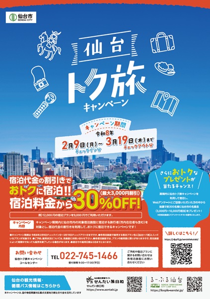 市内の宿泊施設(106施設)を対象に、1人1泊当たり宿泊代金の30%(最大3000円)の割引を適用するプラン。連泊の場合は最長3泊までが対象になる。予約開始は2月4日(水)9時から。実施期間内であっても、予算上限に達した時点で予約受付は終了になる。申し込みは、宿泊施設に直接、もしくは宿泊予約サイトなどで。プラン名に「仙台トク旅」というキーワードが入っているものが対象プランだ。 詳細は、特設ホームページでチェックできる。