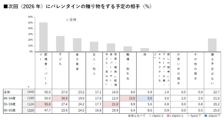 最初の問いでは「自分が30歳の頃にバレンタインデーの贈り物をしていた相手」と「次回(2026年)にバレンタインの贈り物をする予定の相手」について聞くと、30歳の頃は①「配偶者・パートナー」②「職場・取引先」③「子ども」の順番だったが、今年は①「配偶者・パートナー」②「子ども」③「自分自身」になっている。「職場・取引先」と回答した人は32%から9%の6位に激減。