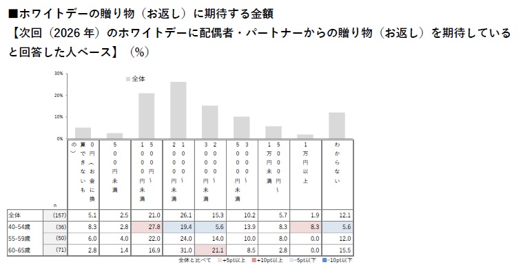 気になるホワイトデーのお返しについては、「贈り物(お返し)をもらうことは期待していない」と回答した人が52.7%と過半数を占めた。バレンタインデーの贈り物の予算は「2000~3000円未満(21.9%)」が最も多く、高すぎず、低すぎず無理のない範囲で楽しむスタイルが主流となる一方、若年層ほど「期待する贈り物(お返し)の金額」が低く、「倍返し」への期待は薄れつつあるようだ。