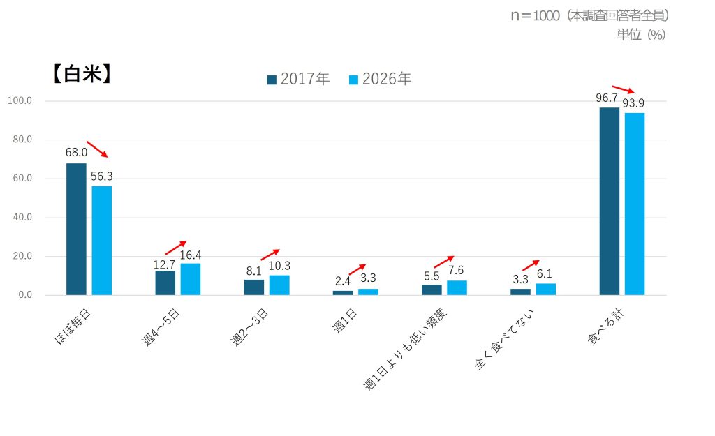 お米(ごはん)を食べる頻度について、「白米」「玄米」「雑穀米」をそれぞれどのぐらい食べるかを聞くと、白米は、2017年から2026年にかけて「食べる計(いずれかの頻度で食べている)」が96.7%から93.9%へと2.8pt低下。また、「ほぼ毎日」は68.0%から56.3%と約12pt低下しており、喫食頻度の高い層を中心に減少が顕著となっている。ちなみに、玄米は「食べる計」が28.1%となり、2017年からの変化はみられず、雑穀米は「食べる計」が38.8%となり、2017年の37.8%から1pt増加した。