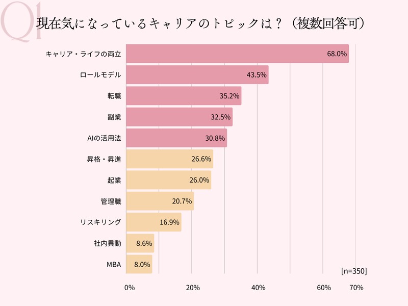 まず、「現在気になっているキャリアのトピック」(複数回答可)について聞いたところ、上位3位は、「キャリア・ライフの両立」(68.0%)、「ロールモデル」(43.5%)、「転職」(35.2%)。昨年と同様に「キャリア・ライフの両立」が最多で、働く女性にとって“両立”は依然として最重要テーマであることが分かる。一方で、「副業」(32.5%)、「AIの活用法」(30.8%)、「昇格・昇進」(26.6%)などへの関心も一定数見られ、関心テーマの多様化も見られた。