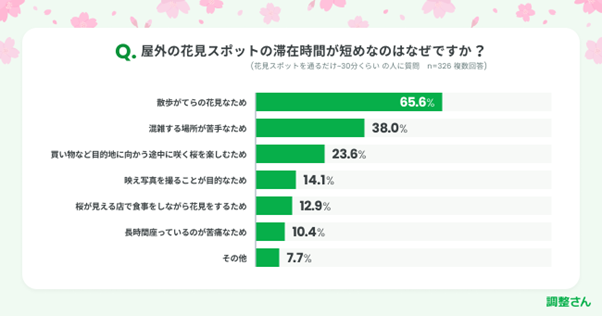 花見が短時間となる理由について聞くと「散歩がてらの花見なため」が約7割で最多だった。2番目の多さとなったのは「混雑する場所が苦手なため」(38%)。また「その他」を選んだ人の具体的な理由では「花粉症のため」が複数あったほか、「まだ寒いため」という回答も目立った。季節の風物詩であるお花見も、短時間で楽しむ人が一定数いるようだ。