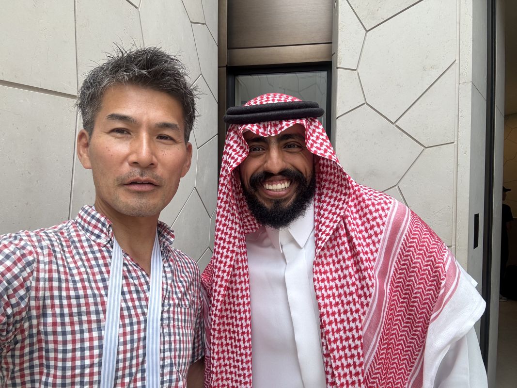 大阪・関西万博で、次の開催国サウジアラビアのパビリオンを訪ね、23年カタール万博で出会ったスタッフ(右)と再会(二神︀さん提供)