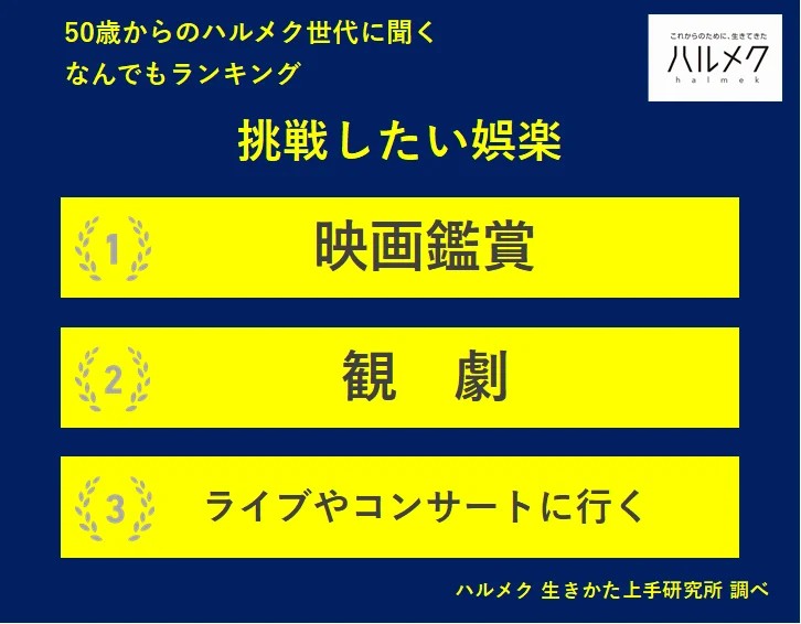 それによると、「挑戦したい娯楽」の1位は「映画鑑賞」。50代から70代以上のすべての年代で首位を独占しており、世代を問わない人気がうかがえる。2位には「観劇」、3位には「ライブやコンサートに行く」がランクイン。上位を占めたのは、いずれも特別な準備や高度な技術を必要とせず、思い立った時に足を運べる「鑑賞型」の娯楽。挑戦したい理由として「気分転換」や「非日常を味わいたい」という声が多く、日々の生活に心地よい刺激を求めている様子が読み取れる。