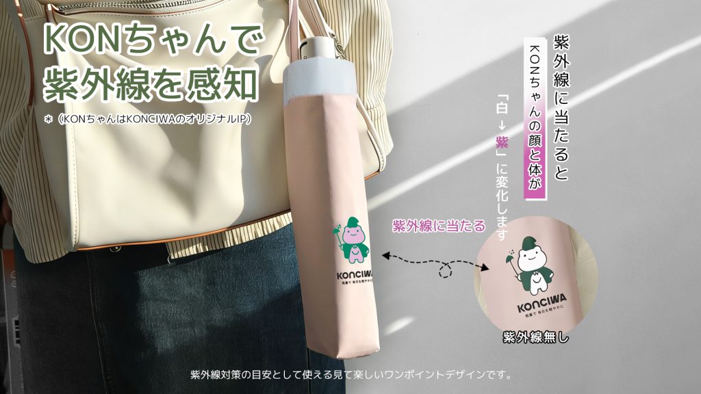 サイズは親骨が50cm、全開時直径が約90cm。収納ポーチには、紫外線に反応して白から紫に変化するキャラクター「コンちゃん」をワンポイントで配置。UVの強さを視覚的に把握できる。軽さ、収納性、遮熱性、デザイン性を高い次元で融合した日傘は、日常の外出をより快適にしてくれそうだ。