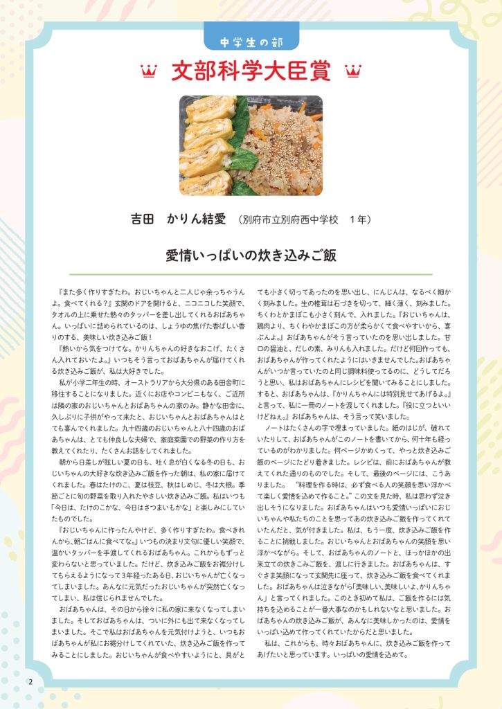 「弁当の日おいしい記憶のエピソード」文部科学大臣賞を受賞した「愛情いっぱいの炊き込みご飯」吉田かりん結愛さん(別府市立別府西中学校1年)