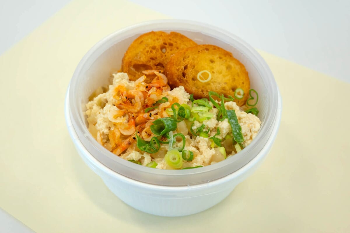 台湾で朝食として親しまれている「鹹豆漿(シェントゥジャン)」をベースに、鶏ガラや桜海老などをプラスしてぜいたくな味わいに仕上げられたお粥。鹹豆漿には欠かせない揚げパン「油条(ヨウティヤオ)」は、成城石井で製造しているバゲットで代用し、本来のものとはひと味違った食感とおいしさを味わえます。