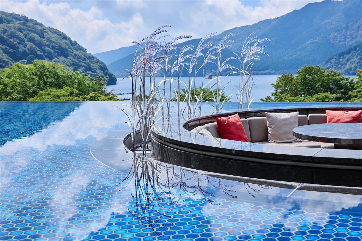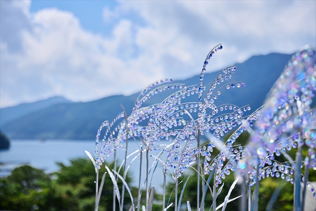 「箱根・芦ノ湖 はなをり」は、水盤に空と山々が映り込む「水盤テラス」がシンボルで、四季折々の美しさが体現されています。2025年10月1日~11月24日の期間、「はなをり」の水盤テラスには、箱根ガラスの森美術館が制作した「クリスタル・ガラスのススキ」が登場。