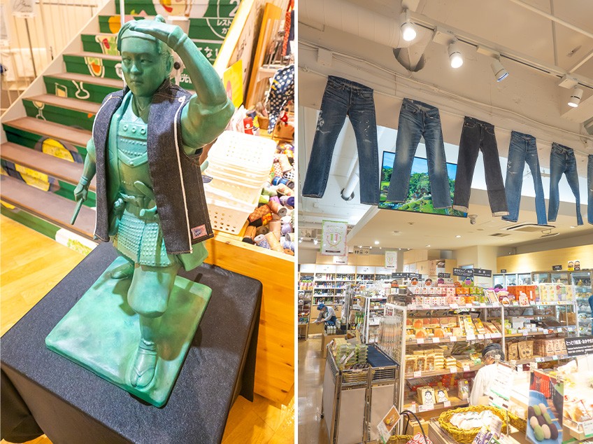 期間中、岡山県が世界に誇る児島地区のデニム一色になる本イベント。店内には、同地区の観光地「児島ジーンズストリート」をイメージしたジーンズの装飾をはじめ、デニム地のオリジナル陣羽織を纏ったここだけでしか見られない“桃太郎像”も登場。