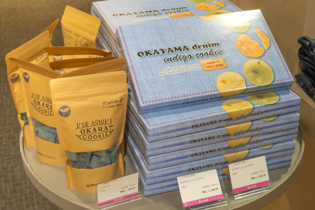また通常、倉敷おからクッキー本店でしか販売されていないデニム色のクッキーのほか、デニム染色インディゴの素である「藍」の抽出液を入れたソフトクッキーも販売。※仕入れ状況により販売が変更になる場合があります
