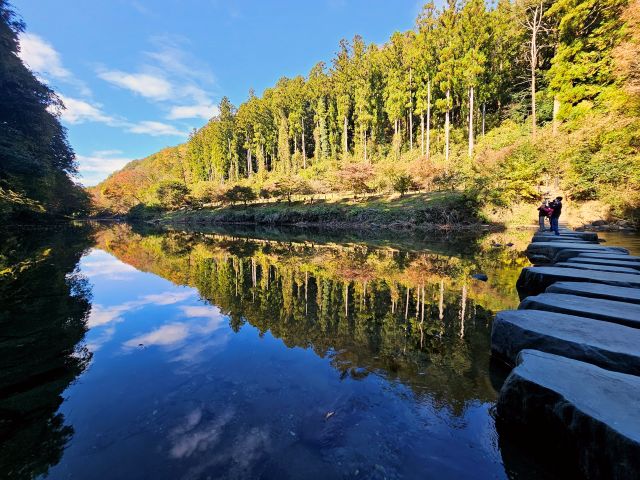 嵐山渓谷は、埼玉県を代表する景勝地のひとつ。岩畳と槻川(つきかわ)の清流と、周囲の木々が織りなす見事な景観が特徴です。